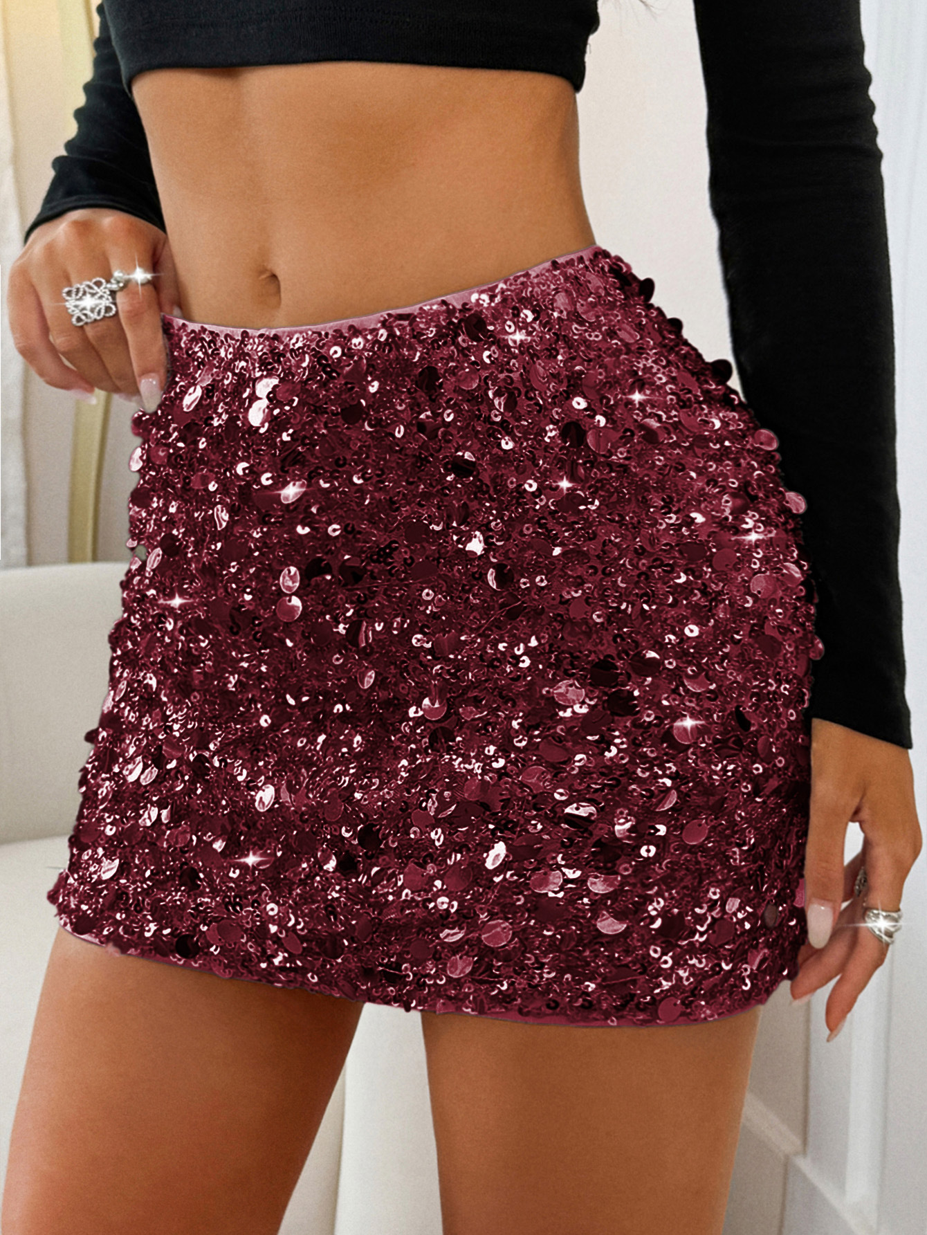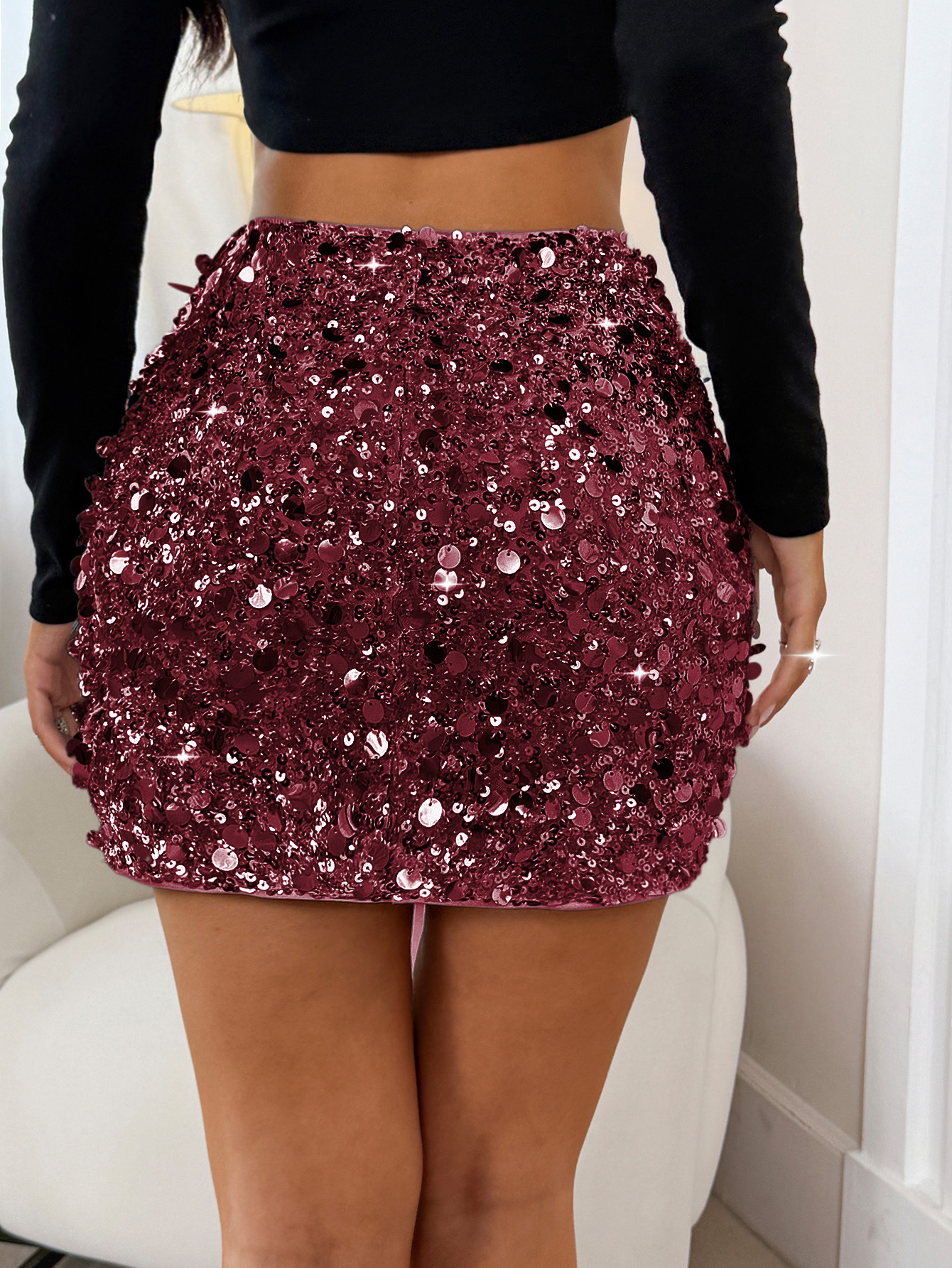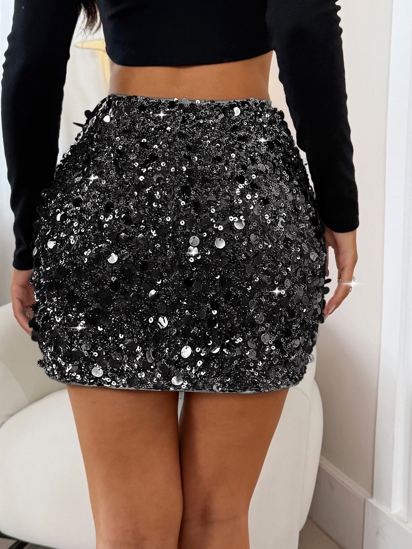 Womens Solid-Color Casual All-Match Sequin Skirt